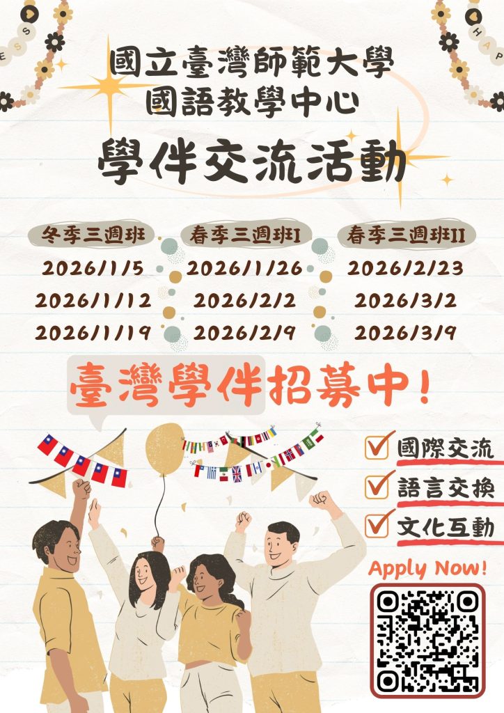 [轉知][NTNU MTC]2026年冬季暨春季中文三週班 臺灣學伴招募中!