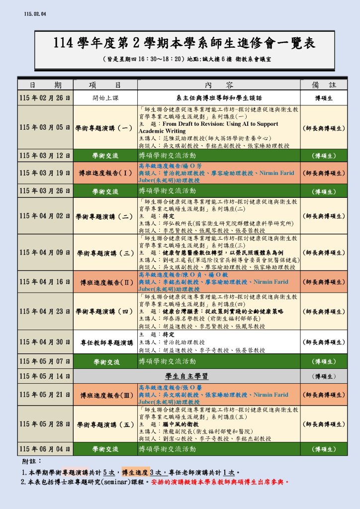 114-2學期本學系 師生進修會一覽表(演講活動)歡迎大家 本學系演講活動一覽表(進修會) 如圖歡迎各位同學或對演講題目有興趣的人 唷~時間都為 周四16:30~18:20地點: 誠大樓6樓 衛教系會議室 Post author:he Post published:2026 年 2 月 11 日