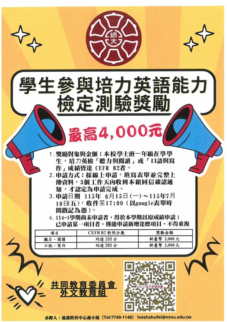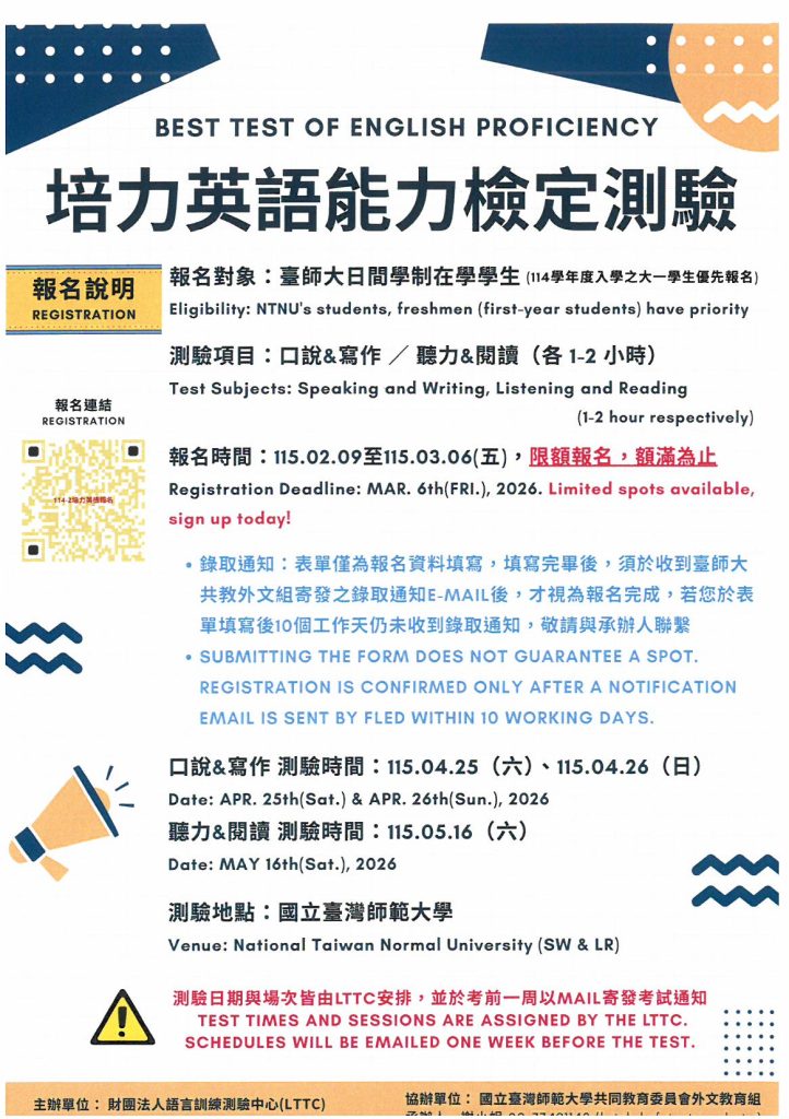 [轉知]114-2學期培力英語能力檢定測驗(BESTEP),歡迎踴躍報考!